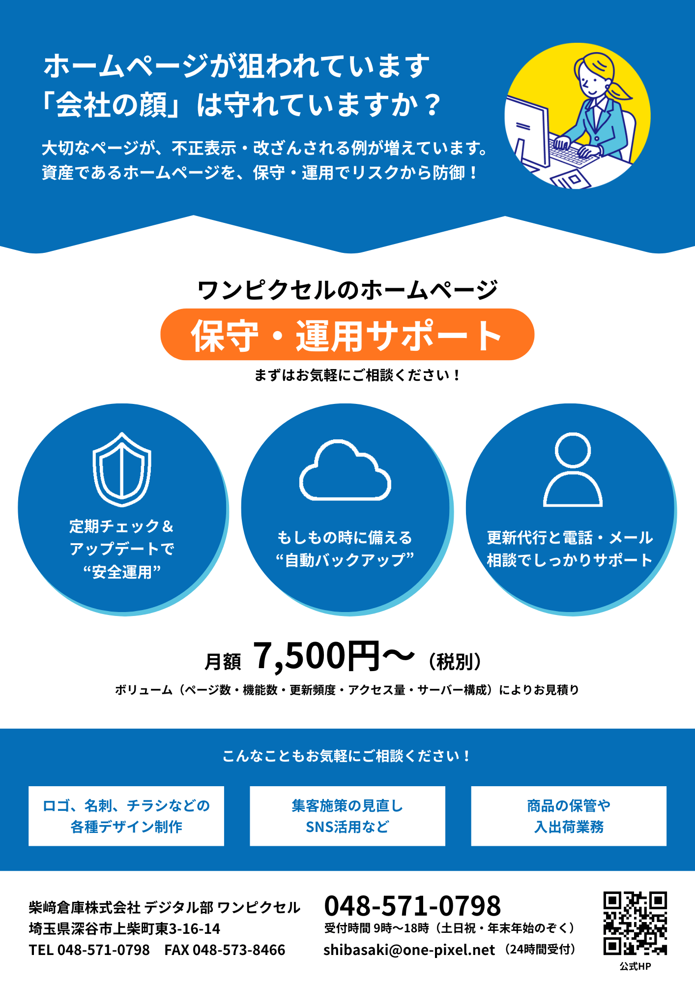 ワンピクセルでは、こうしたトラブルから大切な資産であるホームページを守るため、継続的な保守・運用サポートをご用意しています。